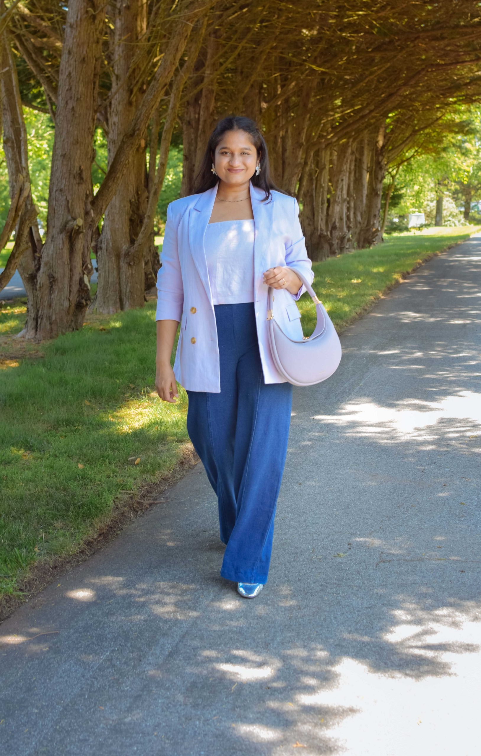 I paired the lavender blazer with a lavender crop top for a monochromatic look and paired it with blue wide-leg jeans and metallic shoes to create a striking contrast that is both modern and elegant.