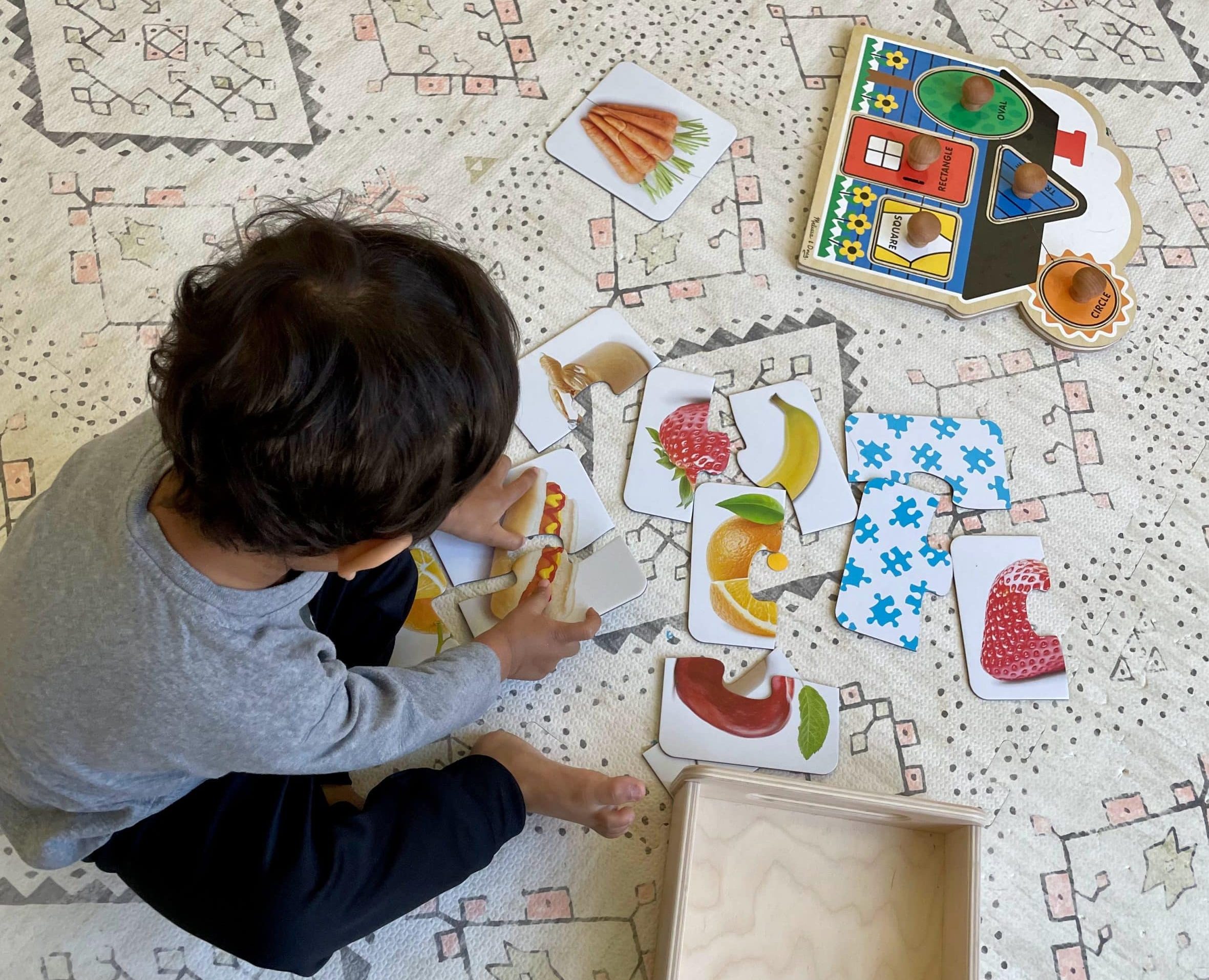 When V was 18 months old, he would recognize if he wore the same color dress as my husband or me. We took this as a sign to introduce matching activities and puzzles to him. Matching puzzles are a great way to help toddlers develop their problem-solving and visual recognition skills. You can introduce several matching puzzles, from color matching to animal, letter, image, and number matching.