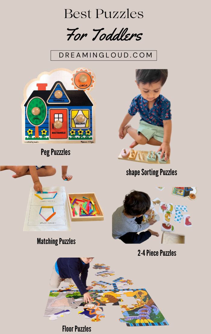 We started with basic shape puzzles, starting with this single-shaped peg puzzle when he was 7-8 months old to this Peg shape puzzle board at 12-13 months. I also recommend these Montessori cylinder blocks, which teach them visual discrimination of high and low, big and small. Here are a few puzzles to consider