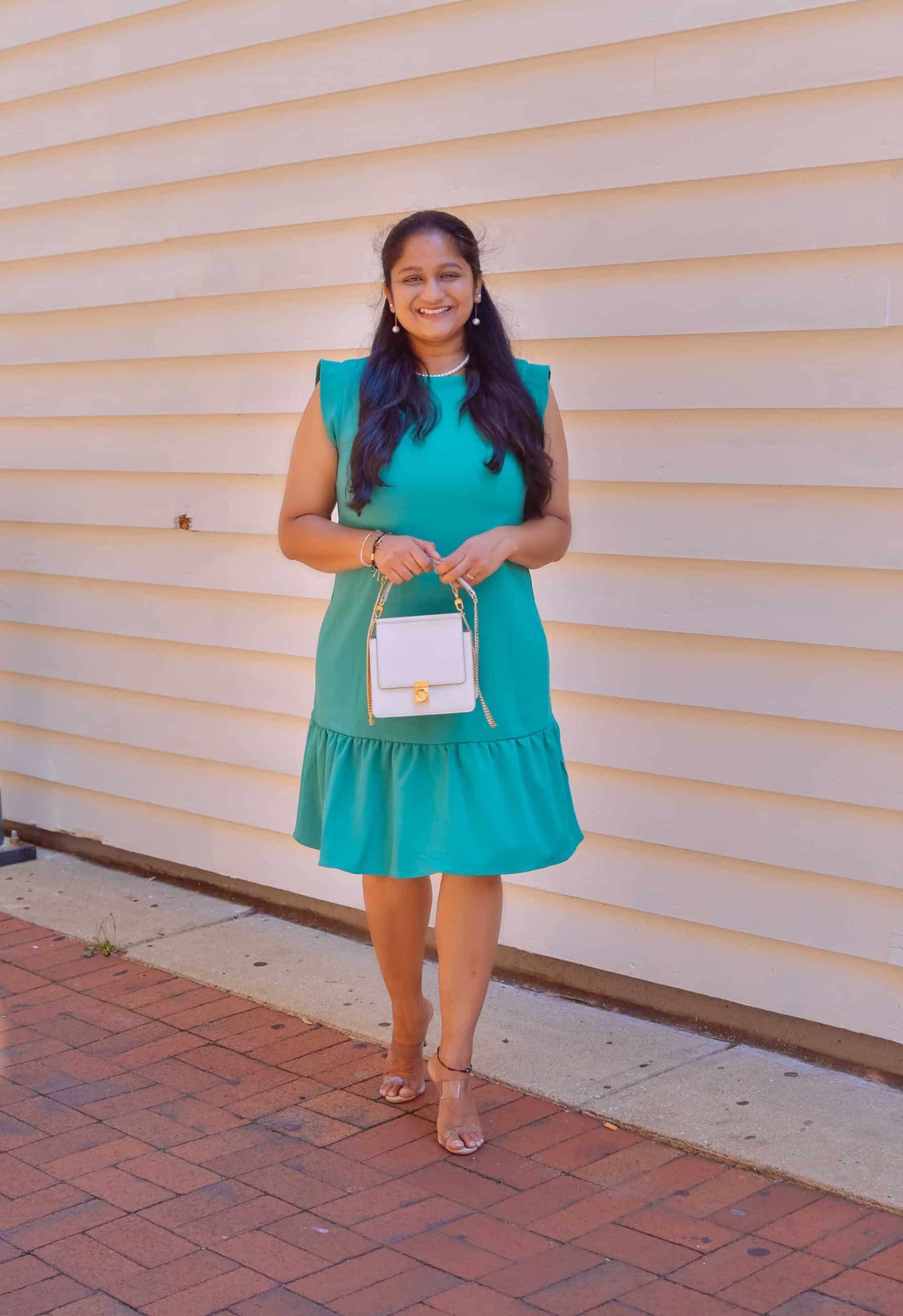 No surprise, I paired the dress with pearl accessories- pearl drop earrings and a pearl necklace. The transparent heels, when you don’t want to add any other color to the outfit, also give an illusion of longer legs.