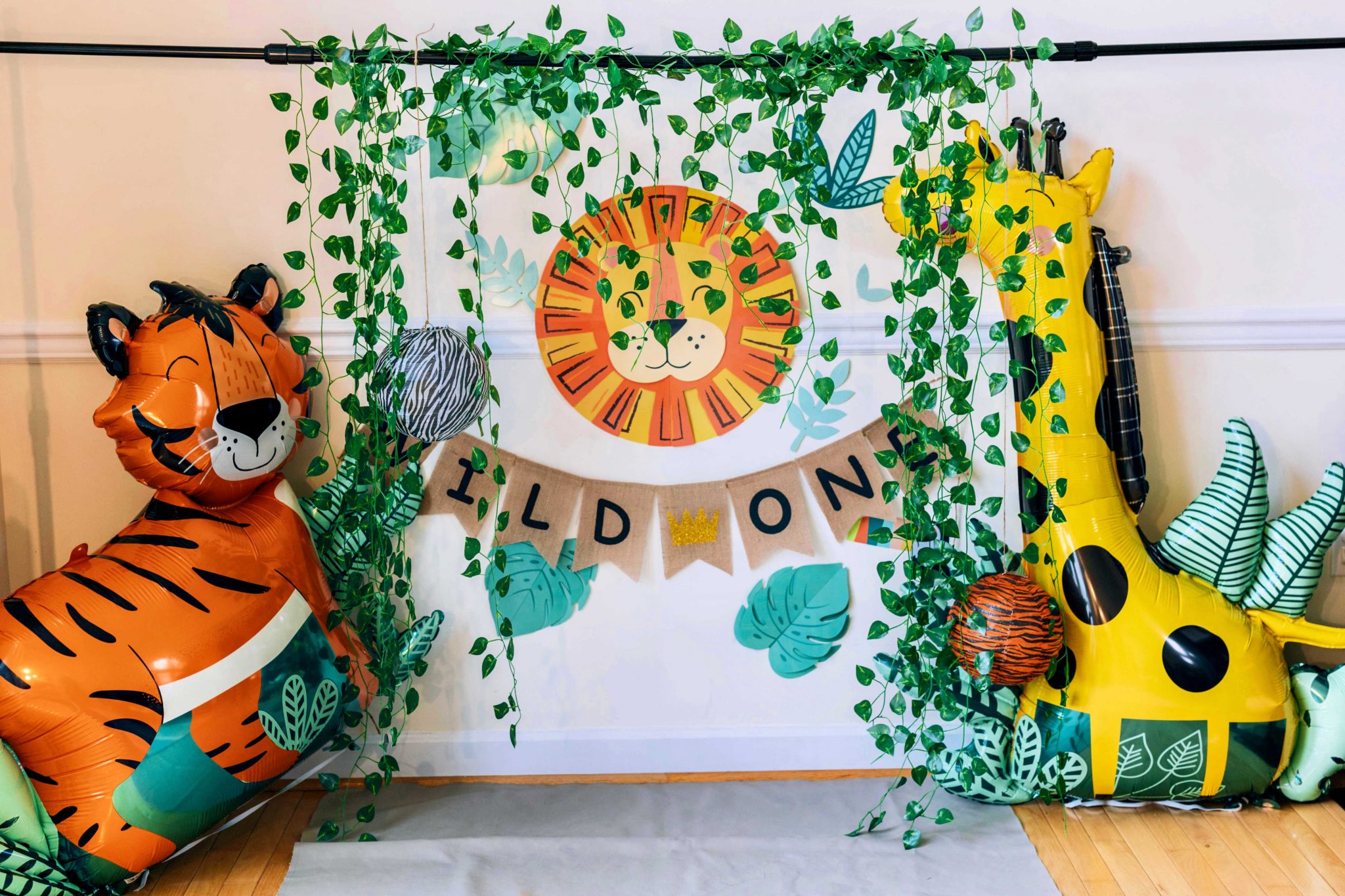 The animal print lanterns were my favorite find. I like finding alternatives for balloons to reduce single-use plastic, and lanterns are hands down my favorites. We hung the 2 lanterns with a rope to the backdrop stand, one on the right and the other on the left. It broke the monochrome green look and added some depth and safari vibes.