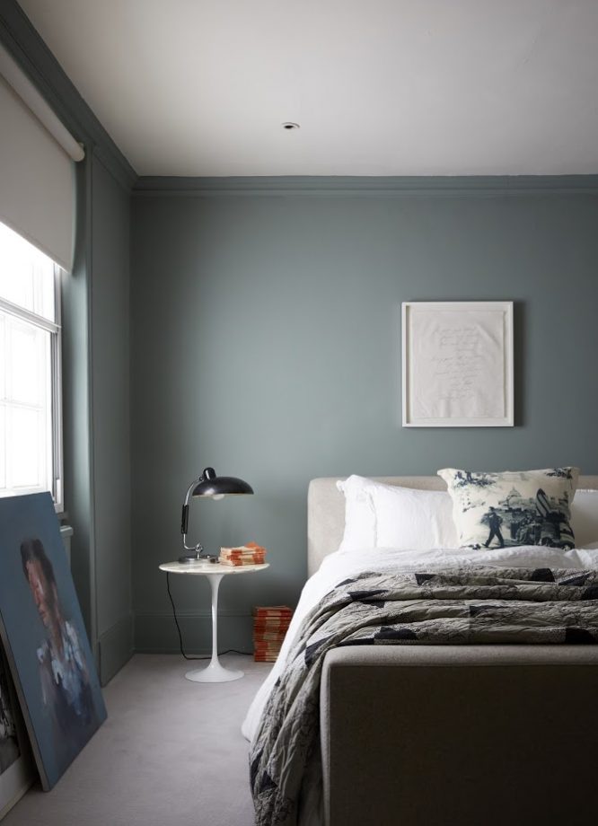 The murky green wall, artwork and the grey bedding brings in the cozy mood while the white stand and printed white pillow adds a nice pop of color without disturbing the mood.