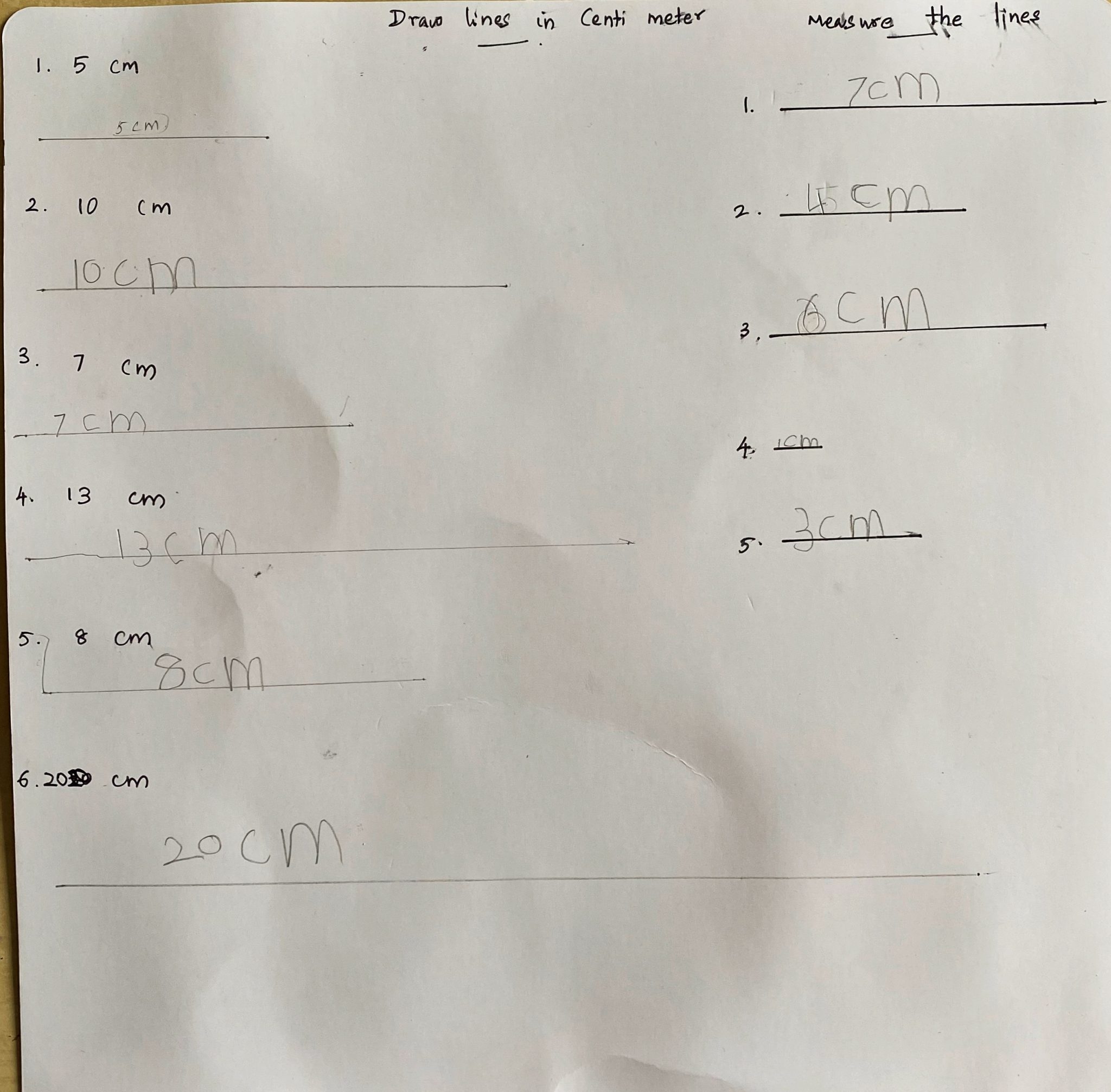 This is a simple but effective learning exercise. Just ask your child to draw lines of given length like below. This helps them understand some metric terms and that the lengths do have some measurement.