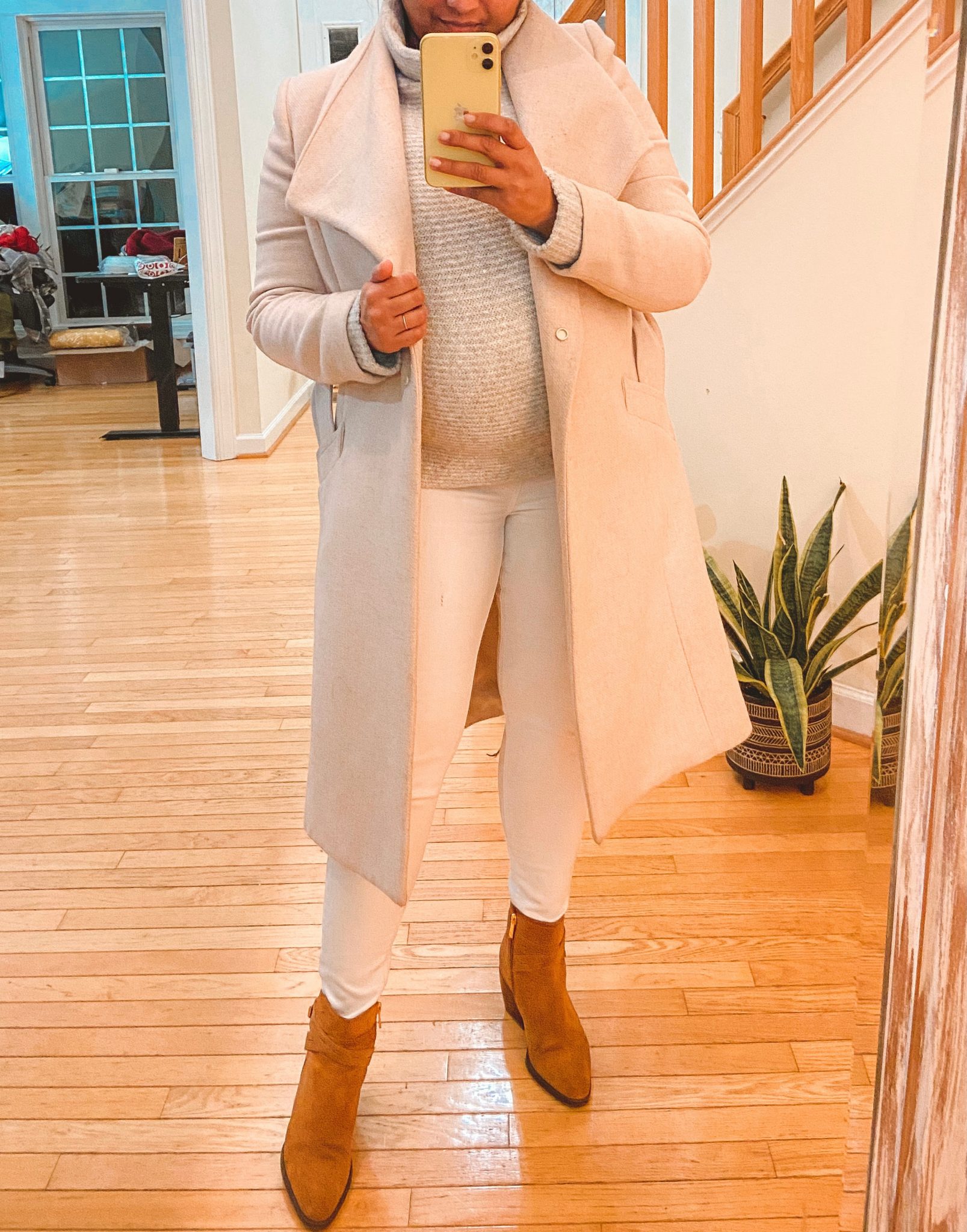 Outfit #3: Amazon sweater (softest sweater; fits TTS, wearing size S) | Mango Maternity jeans (non-maternity version here) | Wrap Coat (in size S) | Naturalizer booties (commute friendly booties, very comfy)