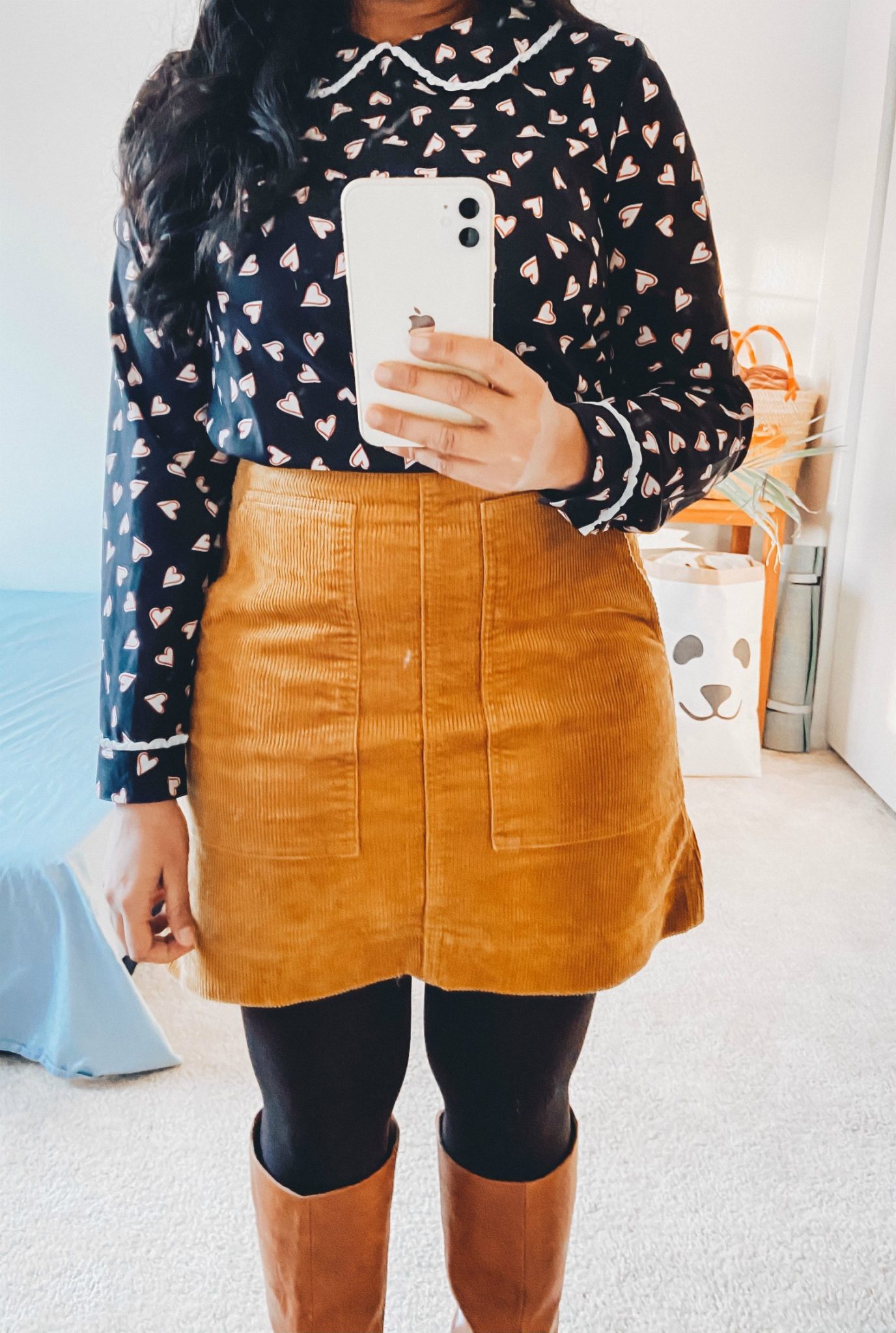 Another outfit you can try for Valentine’s Day is this cute and flirty combination of a mini skirt with ankle boots. You can go colorful with tights or keep it neutral as I did.