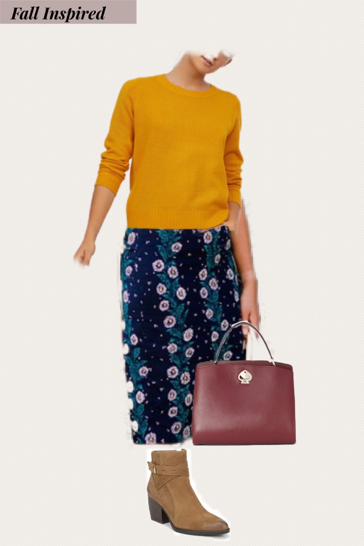 Pair the printed skirt with a sweater or necklace or shoes in a contrasting color. The easiest way to keep the outfit trendy is by choosing seasonal colors. For fall, yellow, burgundy and camel are very much on-trend.