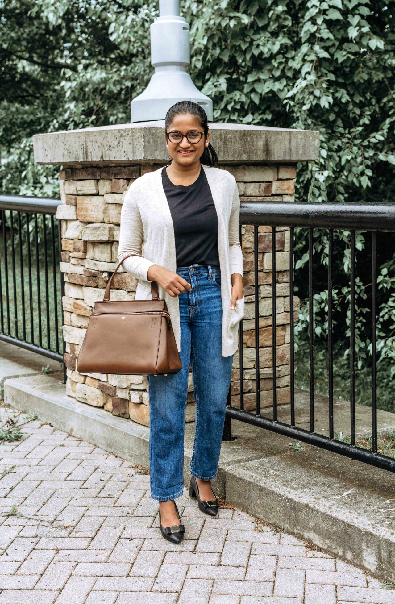 Black tee (wearing size XS) | Jeans(wearing my true size 27) | Cardigan | Pumps | Similar Bag