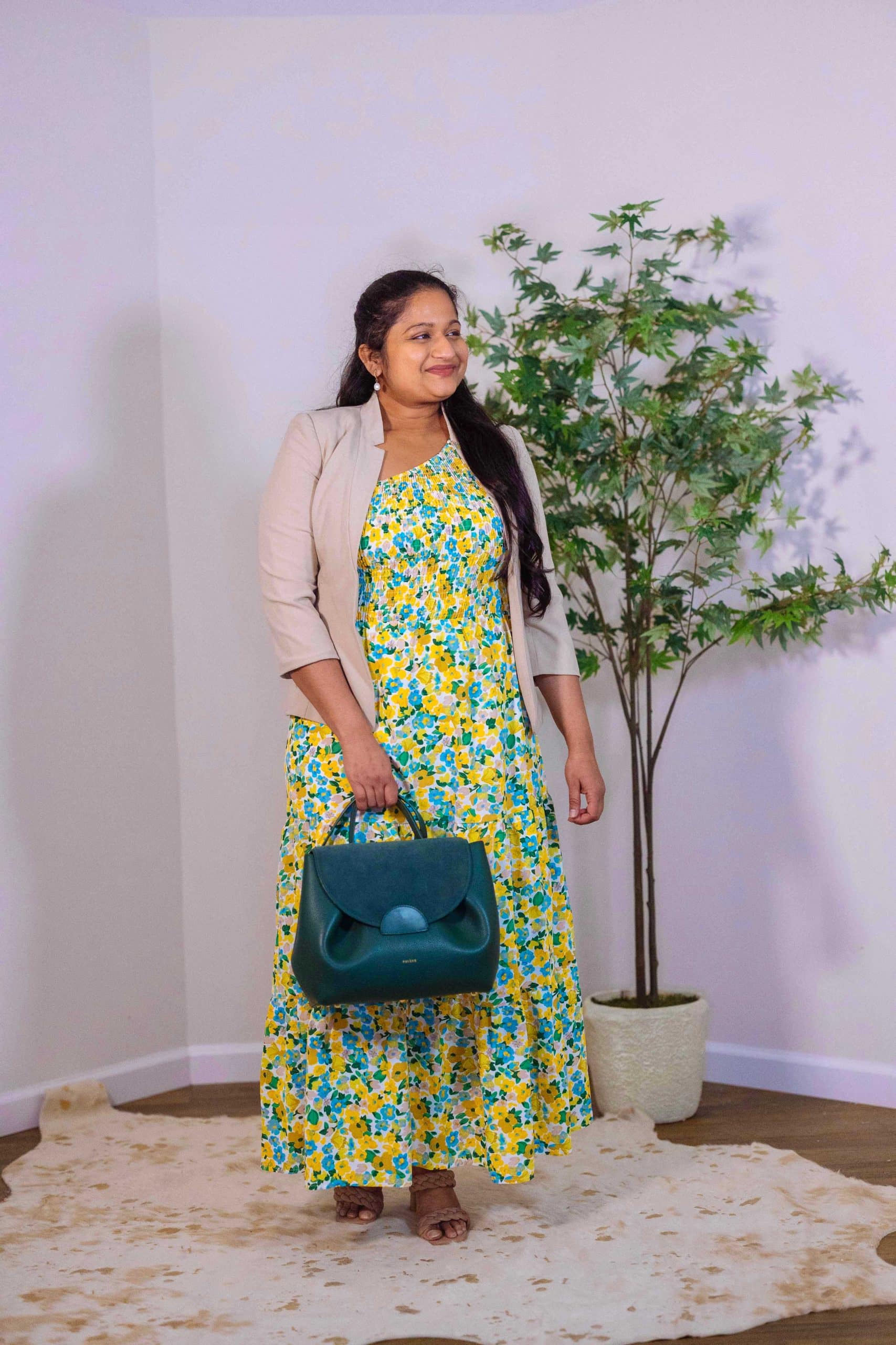 Pair your one-shoulder floral maxi dress with a blazer, work tote, and nude heels for an office appropriate look.