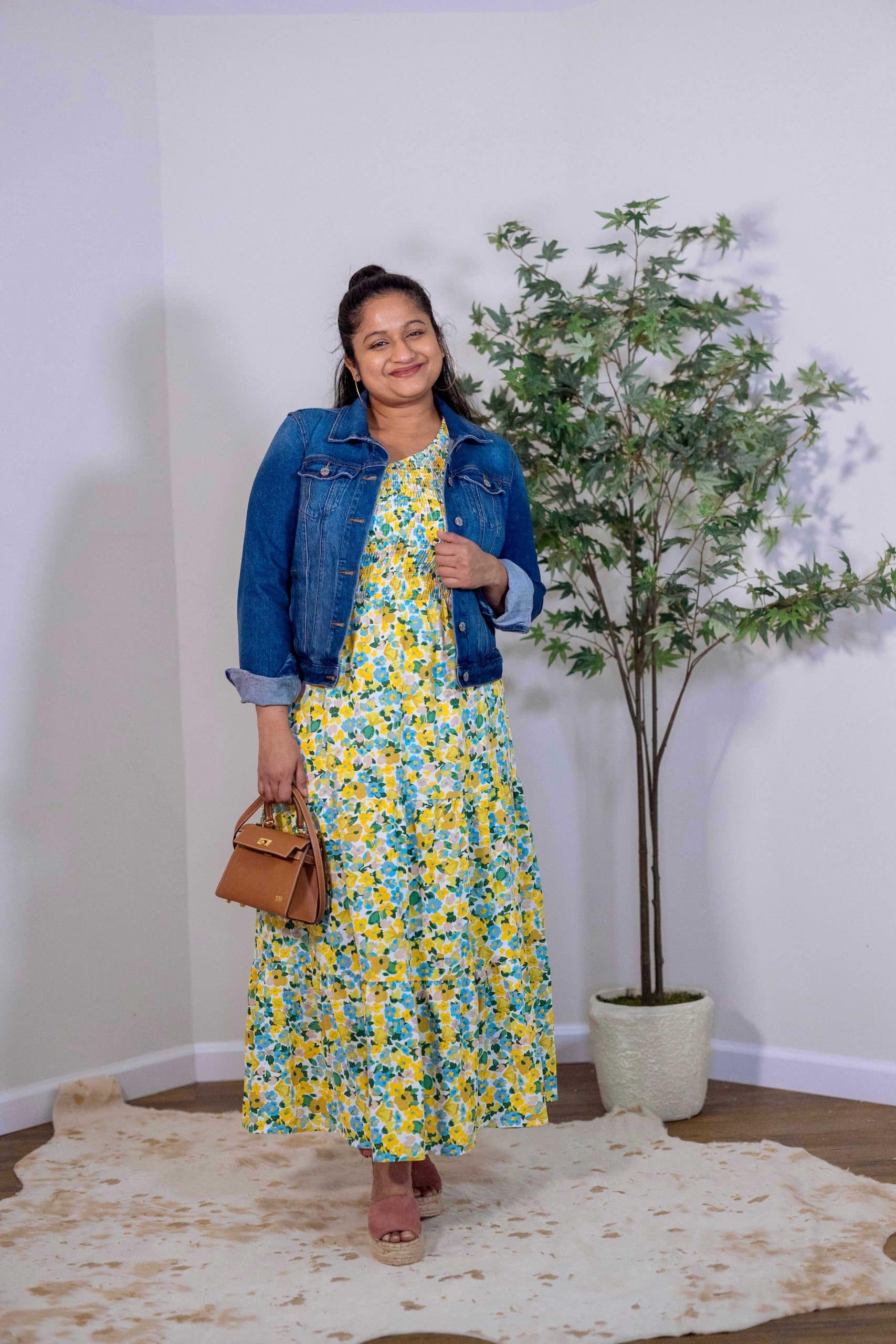 Add a denim or leather jacket and a pair of wedges or booties to your one-shoulder floral maxi dress for a boho-chic vibe. Put your hair into a half bun and hoops to complete the look.