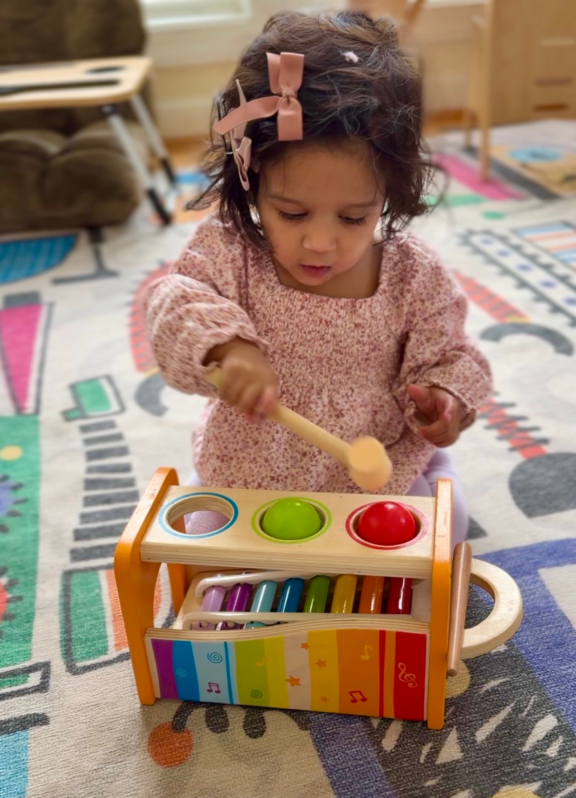 This toy is such a fun one! The pounding with a mallet takes a simple pounding activity to the next level. We actually started without the mallet- just pounding with her hands and I still remember the pure joy on her face the first time it hit the xylophone and made music. That reaction was everything! At around 10 months we introduced the mallet and that’s when it got really interesting to watch her pick up, balance and aim at the ball, it’s no small feat for a baby! It takes real focus and concentration and you can see them working so hard to get it right. Such a rewarding toy to watch them grow with!