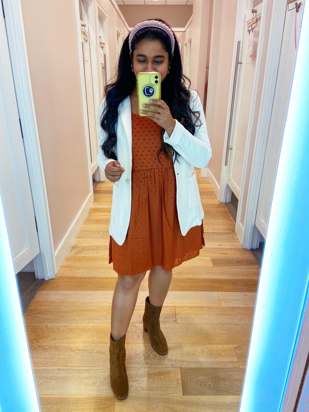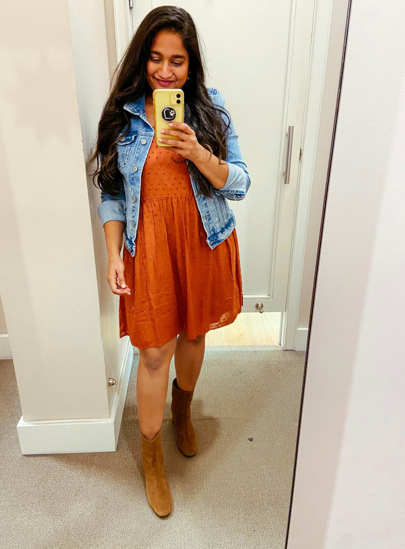Outfit #3: Rust Eyelet dress (on sale for $34.99; fits TTS, wearing size S)
