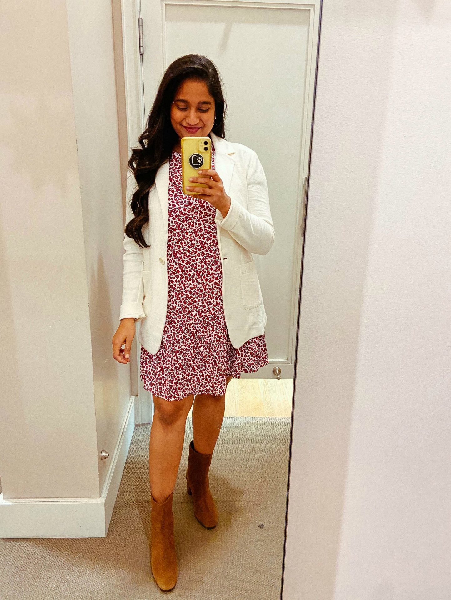 Outfit #2: Knit Blazer | Floral swing dress | Boots (on sale for $118)