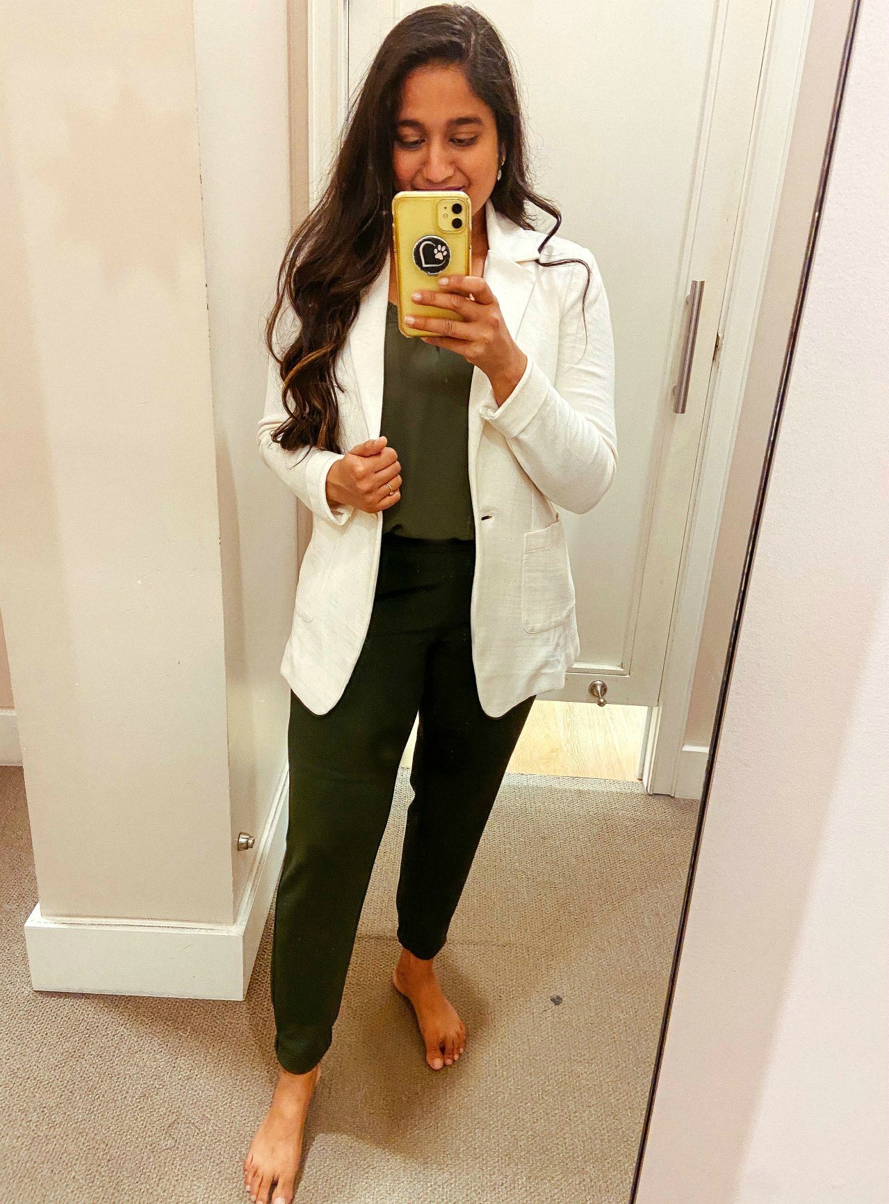 Outfit #1: Knit Blazer (on sale for $53.70; Fits TTS, wearing my regular size 4) | Blouse ($18; fits TTS, wearing S) | Trousers (on sale for $29; fits TTs, wearing Size S)
