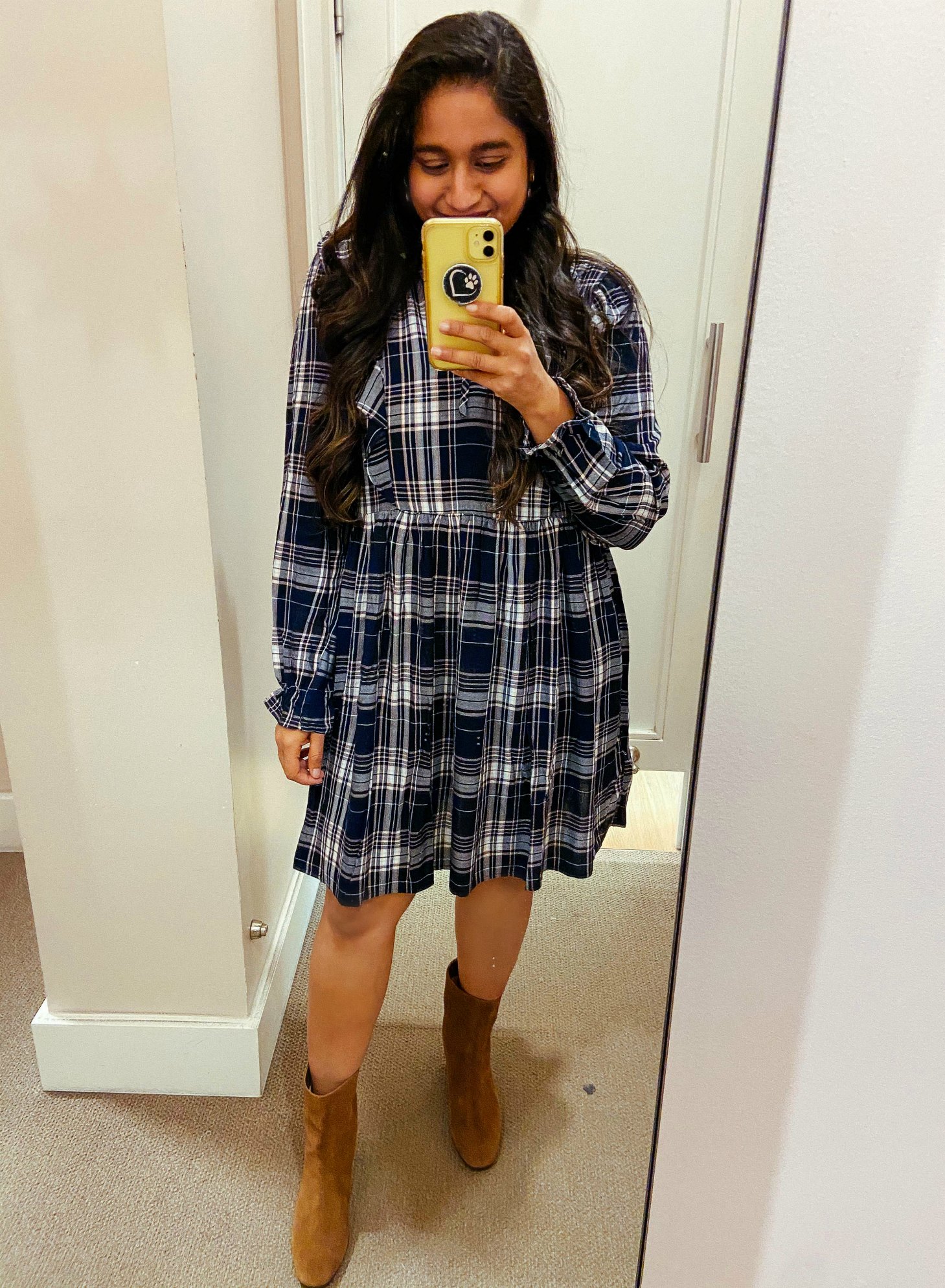 Outfit #2: Plaid dress (runs big, sized down to XS)