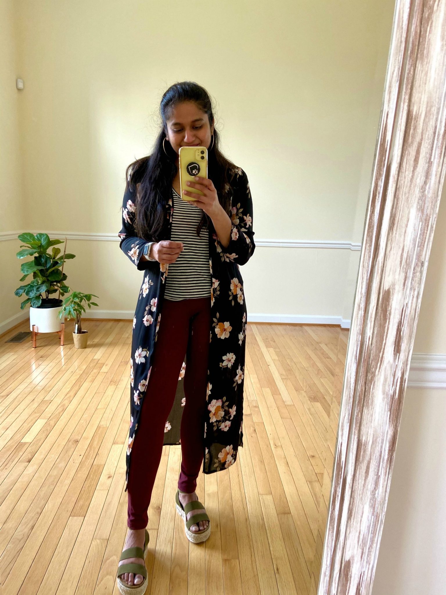 You can wear the burgundy leggings all through the year by layering it season-appropriate pieces. For summer you can layer it by wearing a kimono over it and for colder months swap it with a long/medium length cardigan.