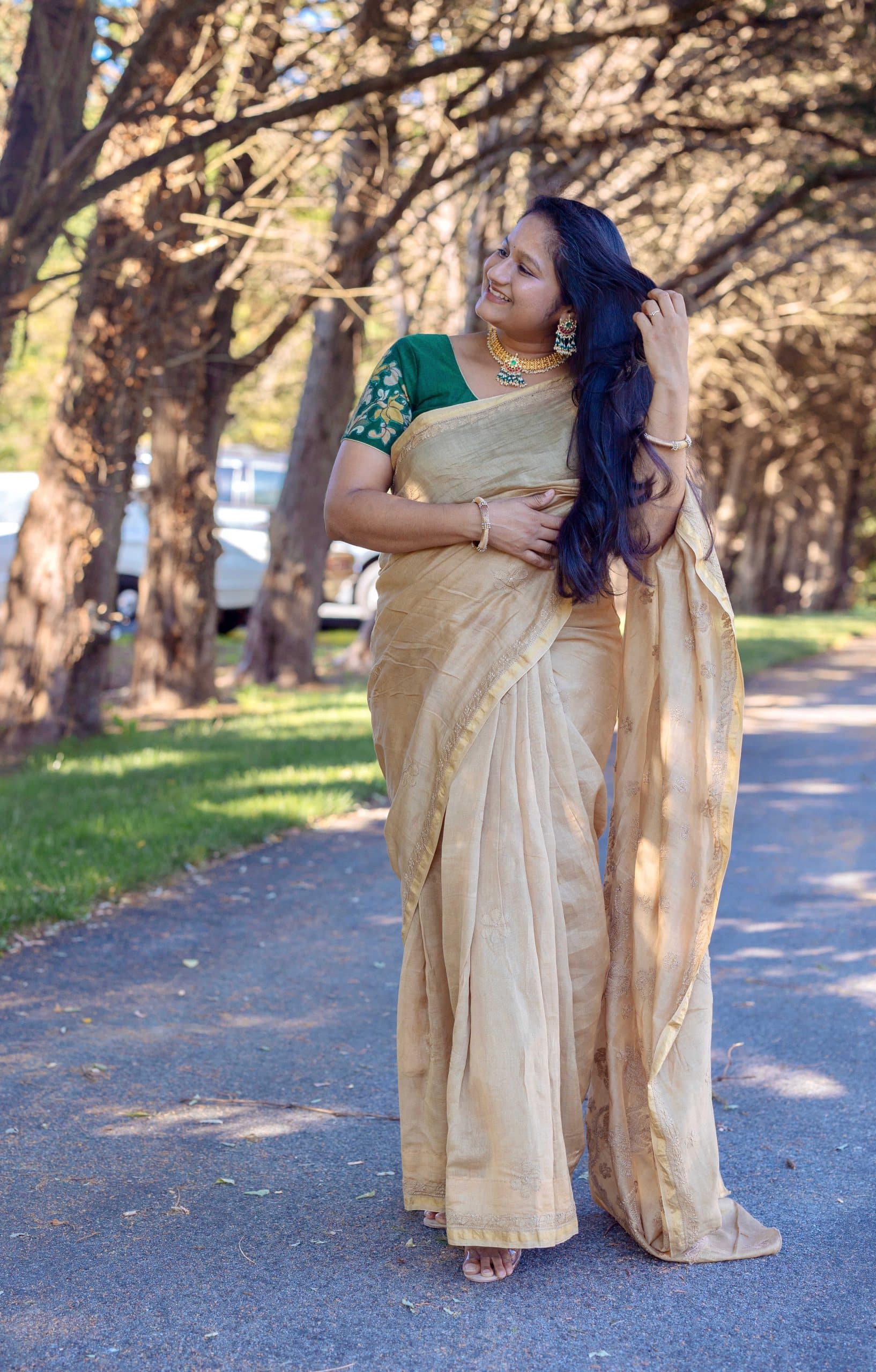 Chanderi Silk Saree with Chikankari Work (sold out in gold, available in light blue, peach, and Pink) – $125
