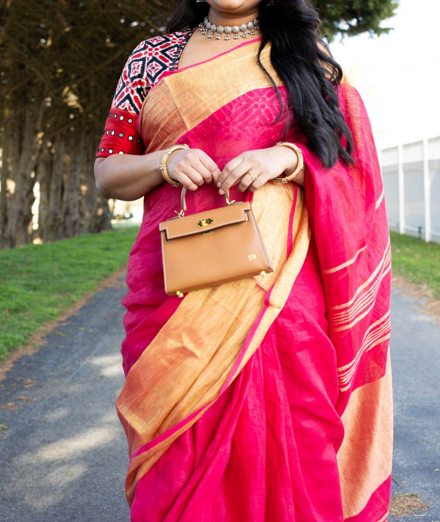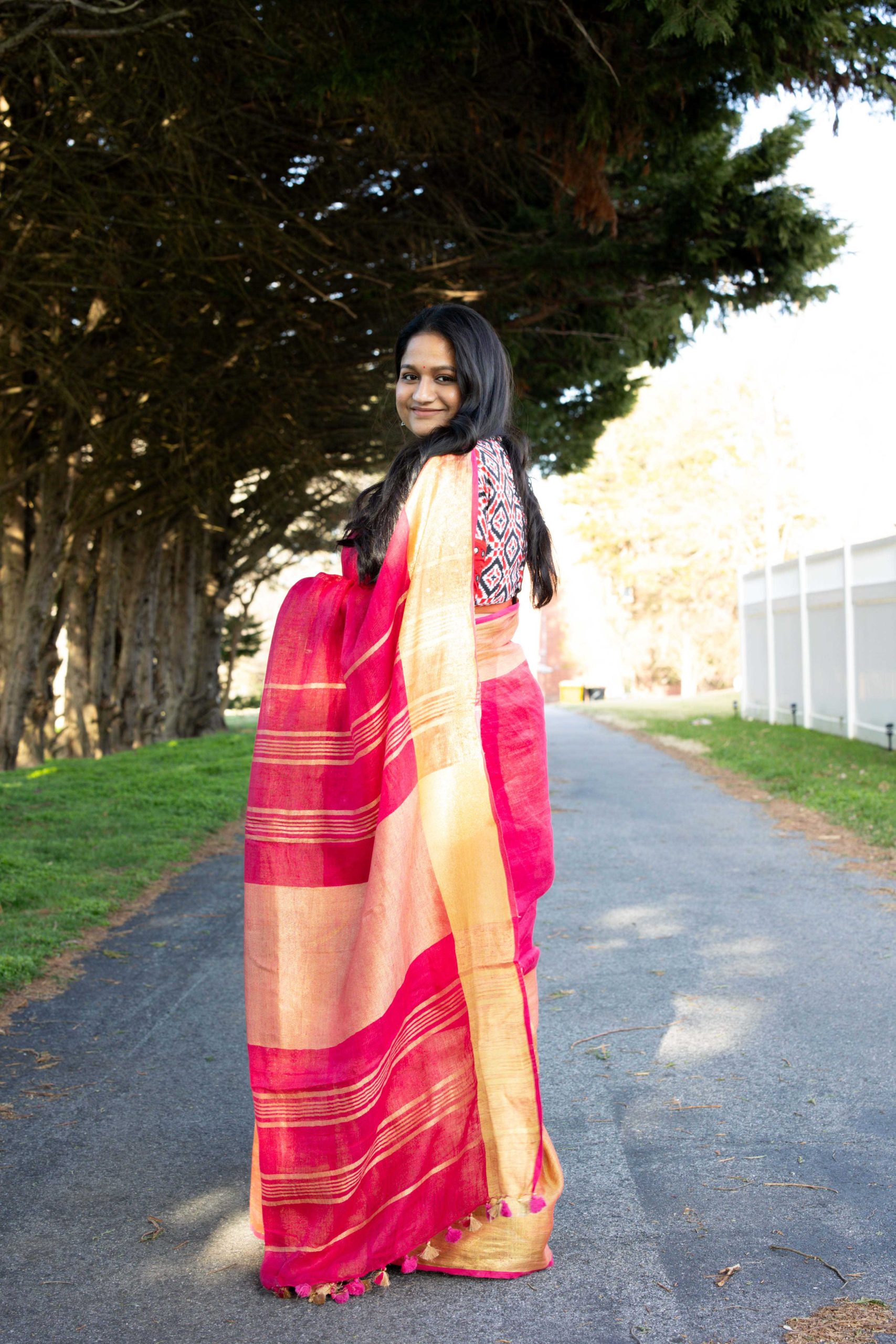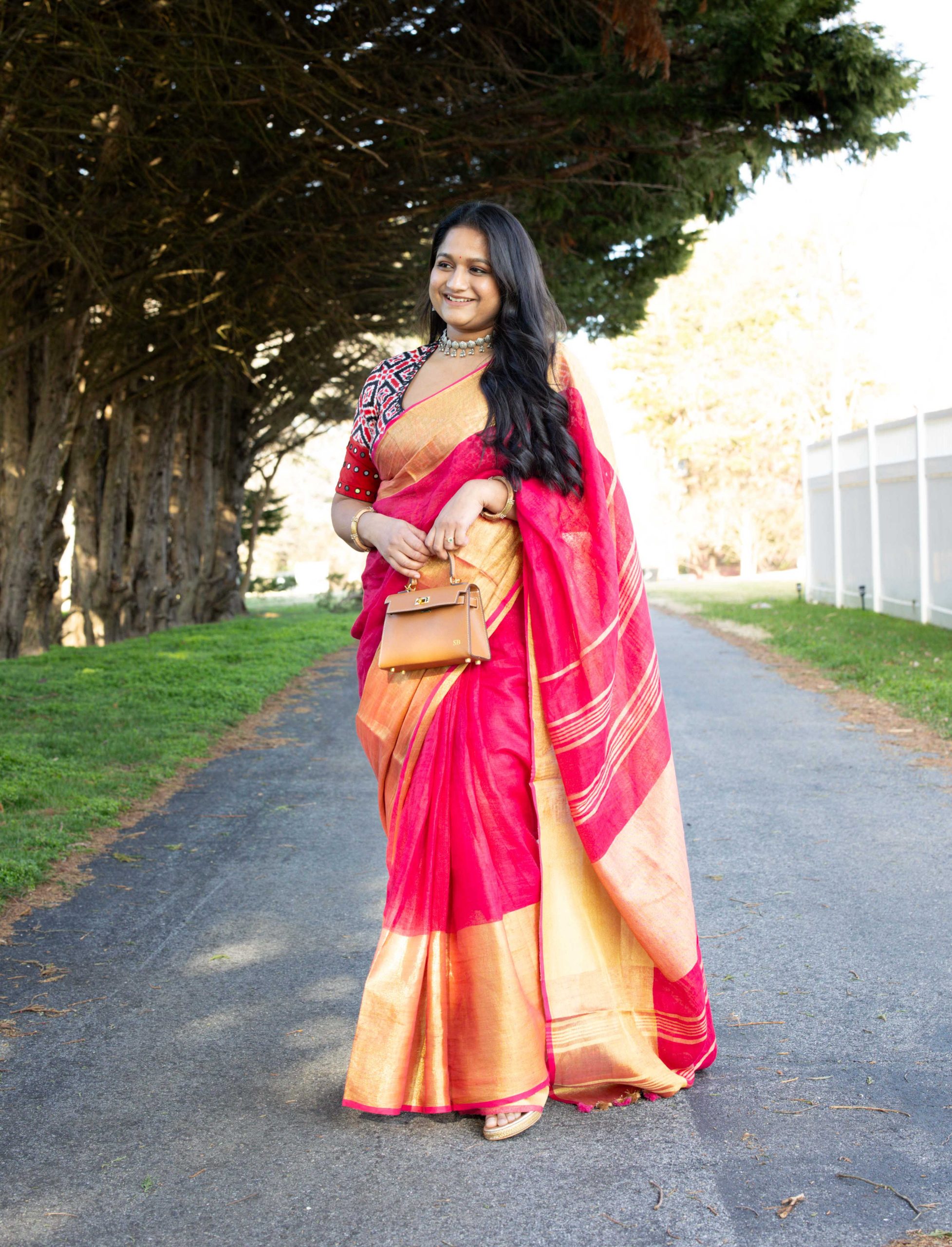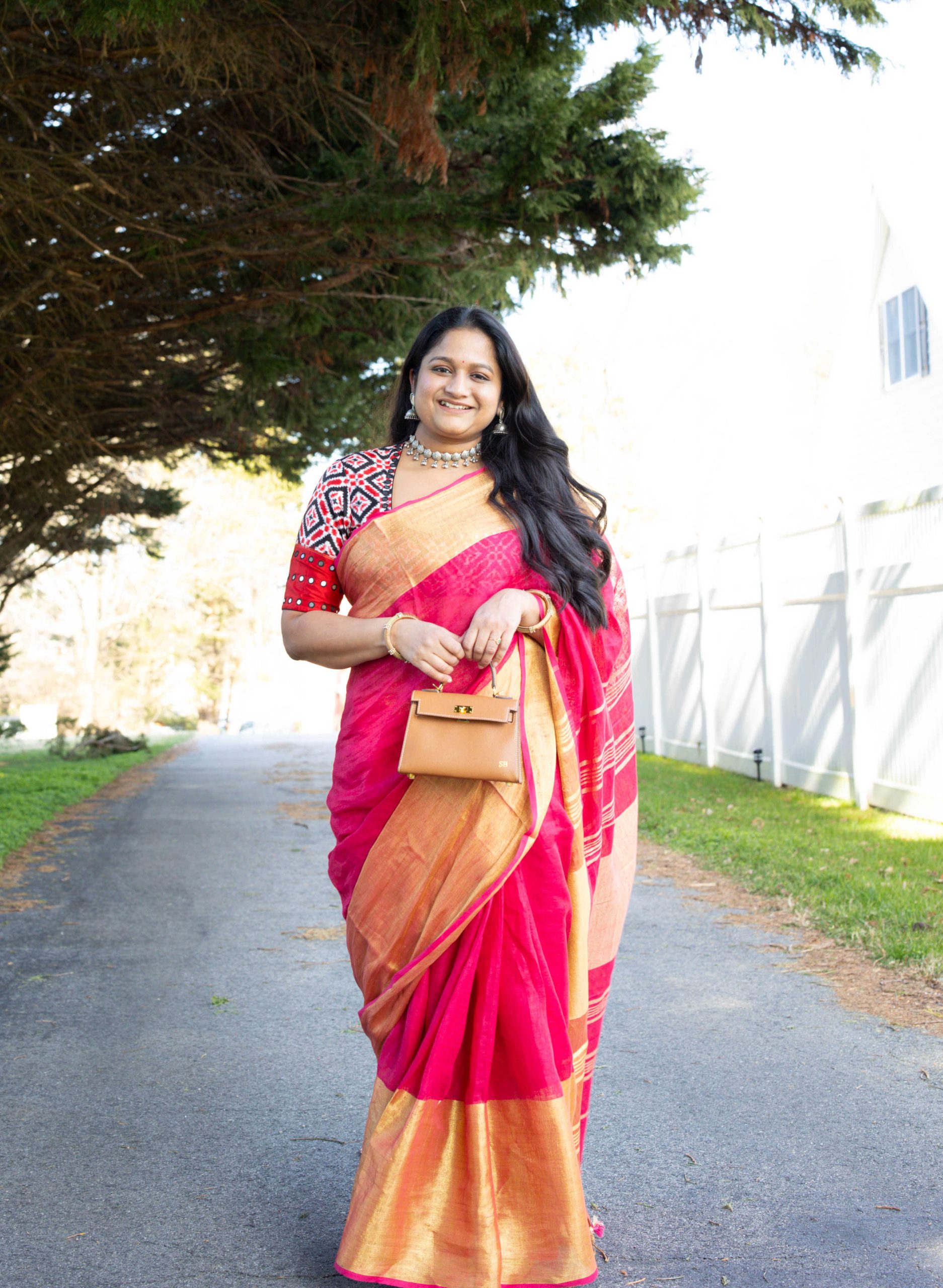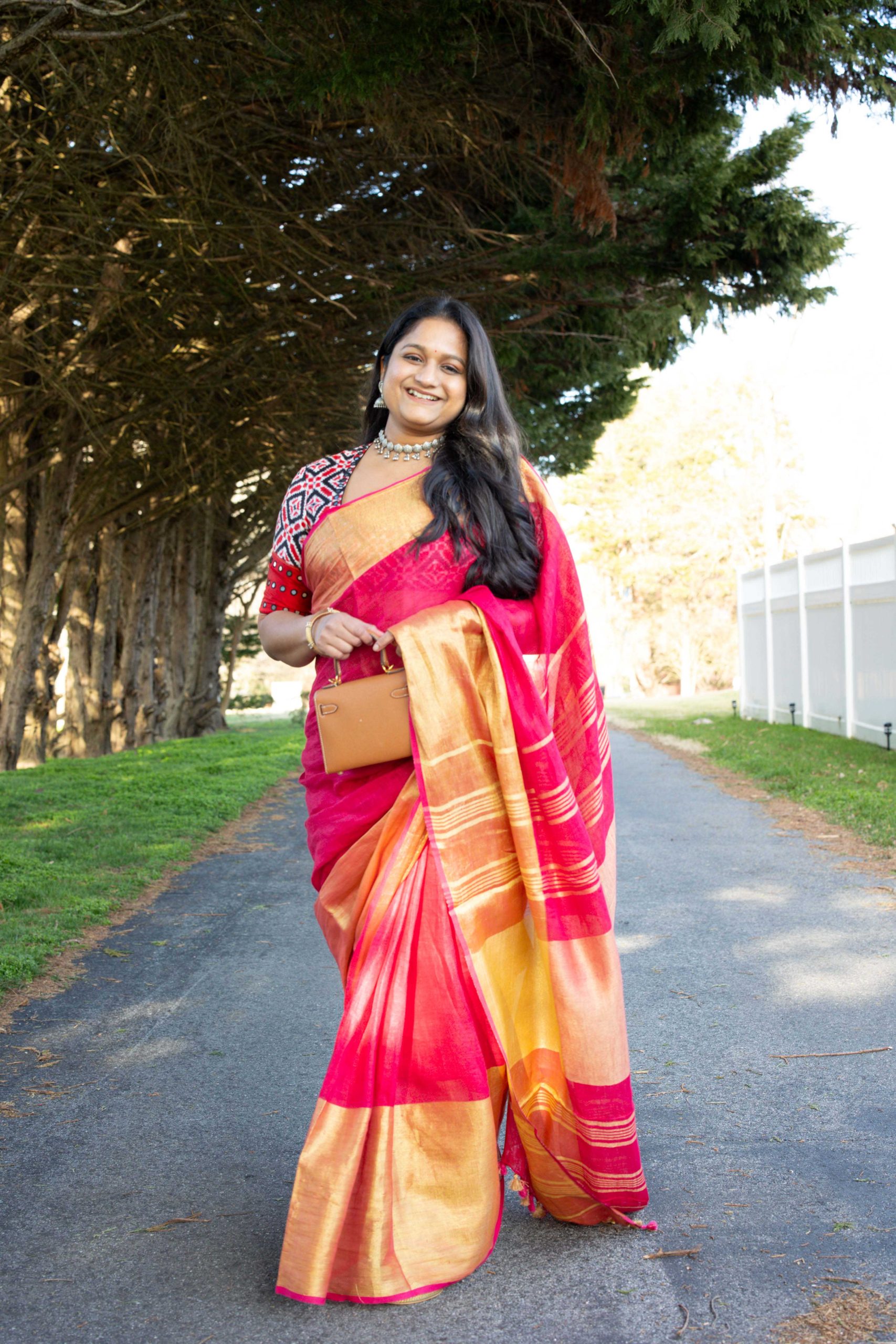 Today, I decided to show some love to this Pink Linen Saree that’s been tucked away in my closet for years. I’ve been consciously re-wearing my entire wardrobe, whether it’s Western or traditional Indian attire. While you can find Western outfit ideas on IG, I’m doing my best to share everything on the blog. Returning to today’s post, let’s delve into the world of linen sarees and explore its harmonious pairing with the Telia Rumal blouse.