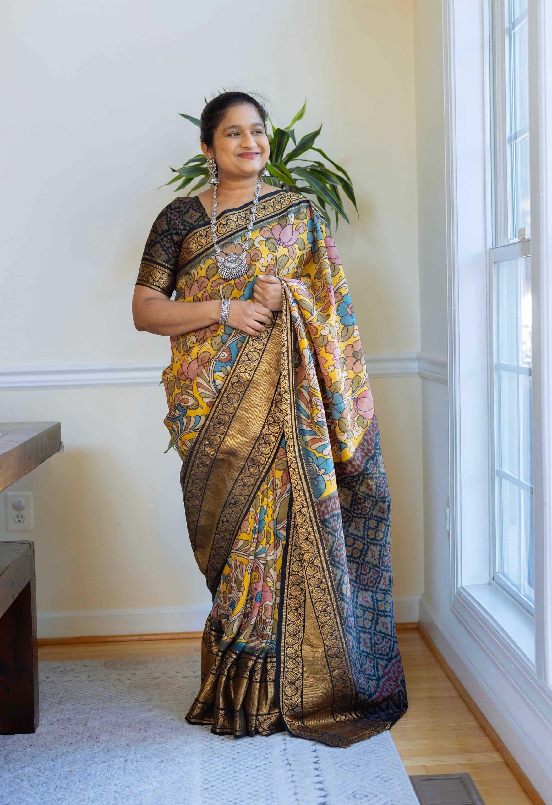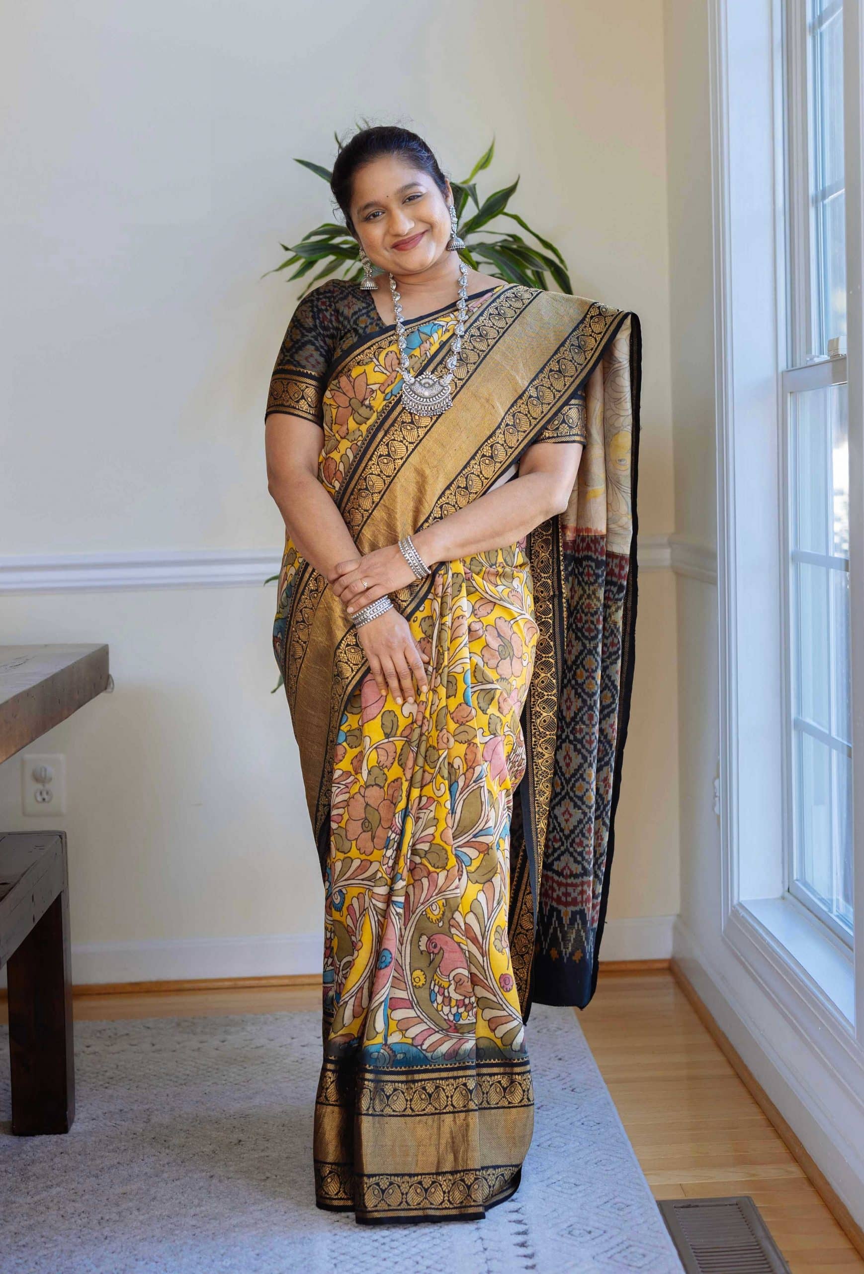 I wore this beautiful Kalamkari Saree With Ikat Patola Pallu for Sankranthi yesterday. I’d never seen a Kalamkari saree with a black zari border before, so it was love at first sight. For a first Kalamkari saree, it was indeed a bold choice. But this won’t be my last; I want one with a blue, red, and green zari border :D.