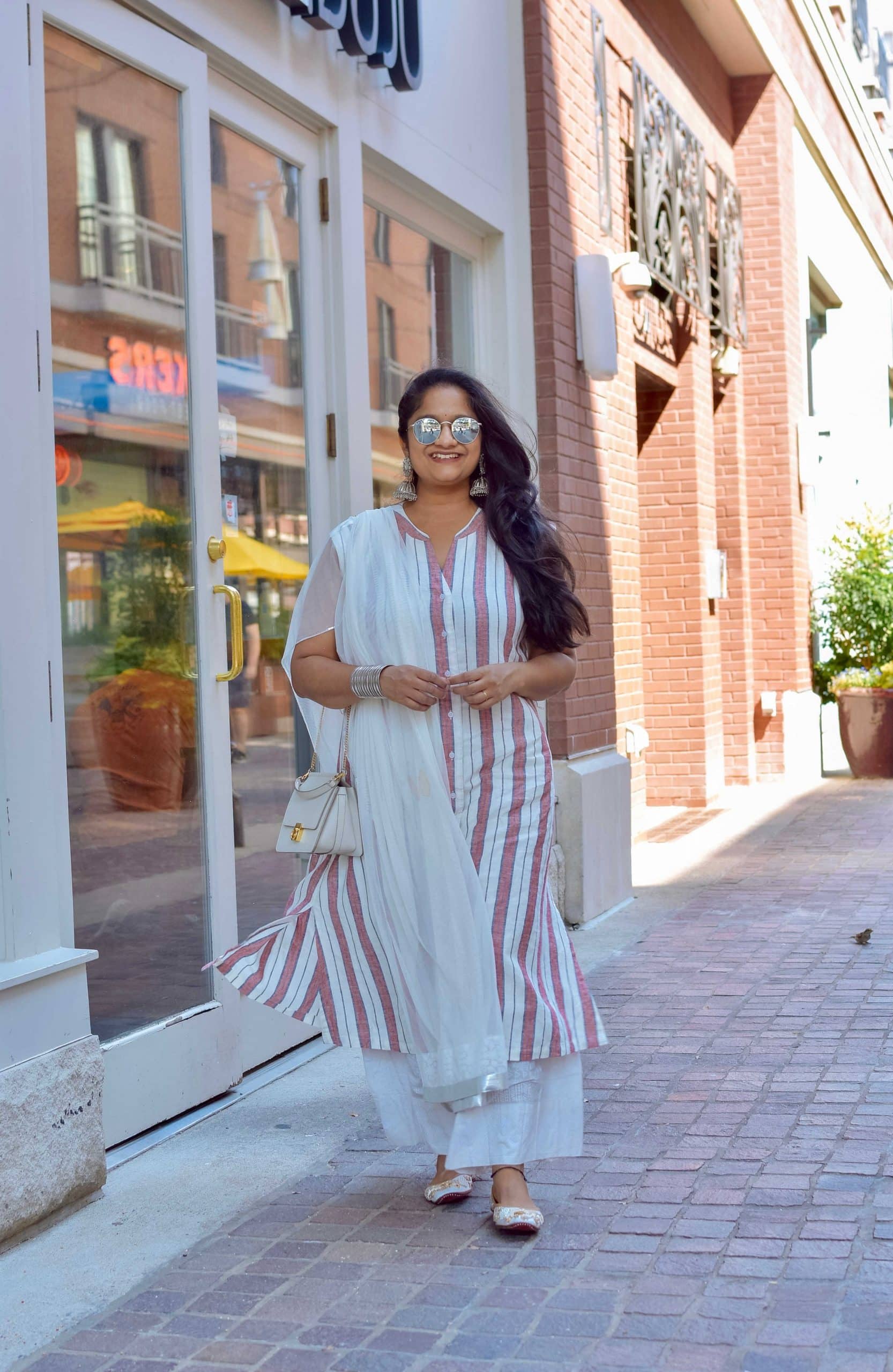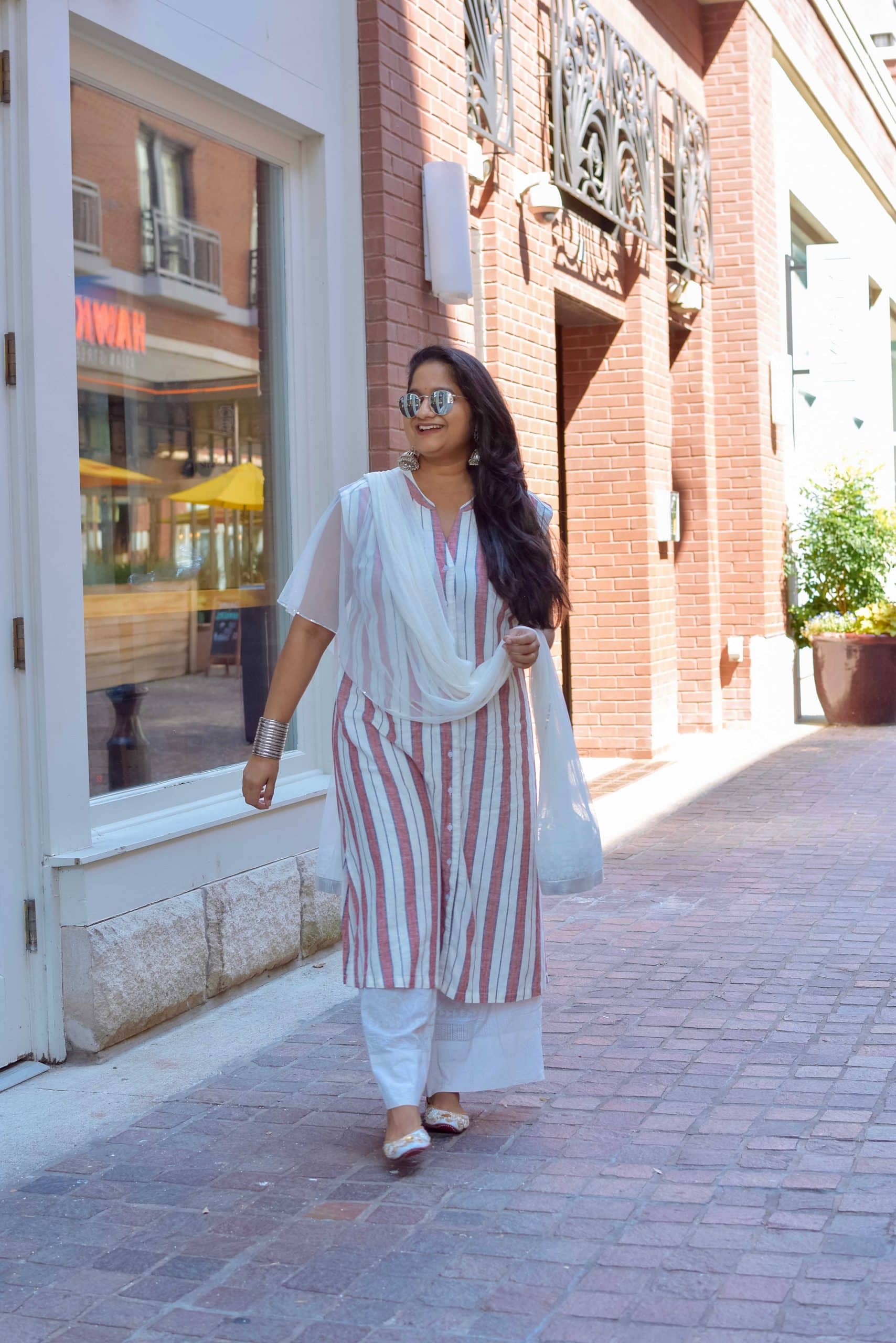 Sharing a simple indo-western Rakhi outfit that you can re-create with the pieces you already own in your closet. If you’re wondering how is this an indo-western look cause it looks like a salwar suit?, well I styled a shirtdress that is seen in this post as Kurti top and paired it with a breezy white palazzo and dupatta that is seen in this post. Alternatively, you can choose an A-line dress and pair it with skinny jeans and + a dupatta to create a traditional Indian outfit. desi.