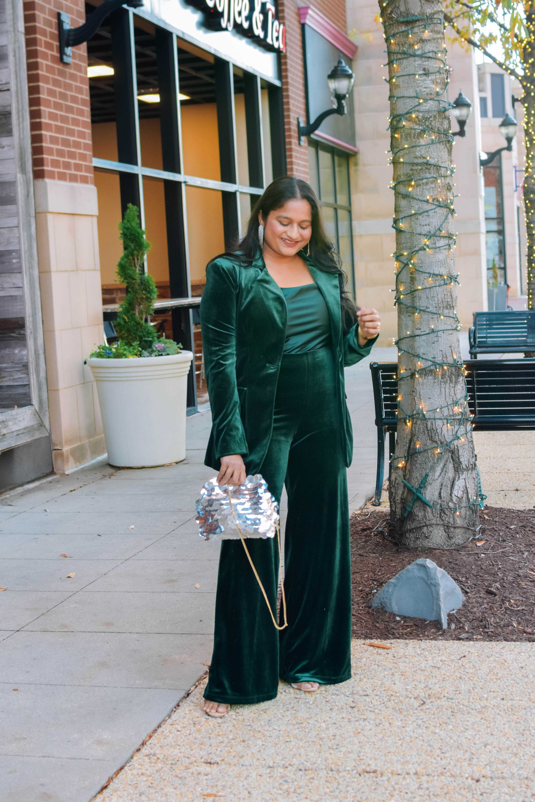 Pairing velvet with a satin camisole is a luxurious match made in heaven. The contrasting fabrics add depth and visual interest to the ensemble, making it ideal for special occasions. To complete the holiday look, I paired it with rhinestone fringe statement earrings and a sequin bag that perfectly complemented the velvet and captured the essence of celebration.
