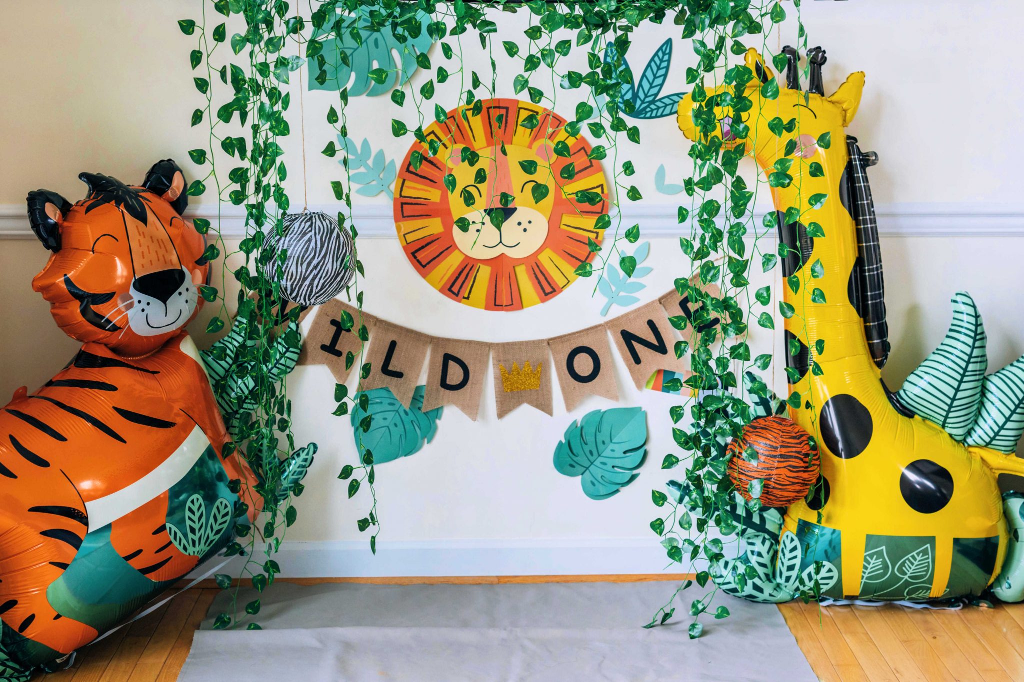 The animal print lanterns were my favorite find. I like finding alternatives for balloons to reduce single-use plastic, and lanterns are hands down my favorites. We hung the 2 lanterns with a rope to the backdrop stand, one on the right and the other on the left. It broke the monochrome green look and added some depth and safari vibes.