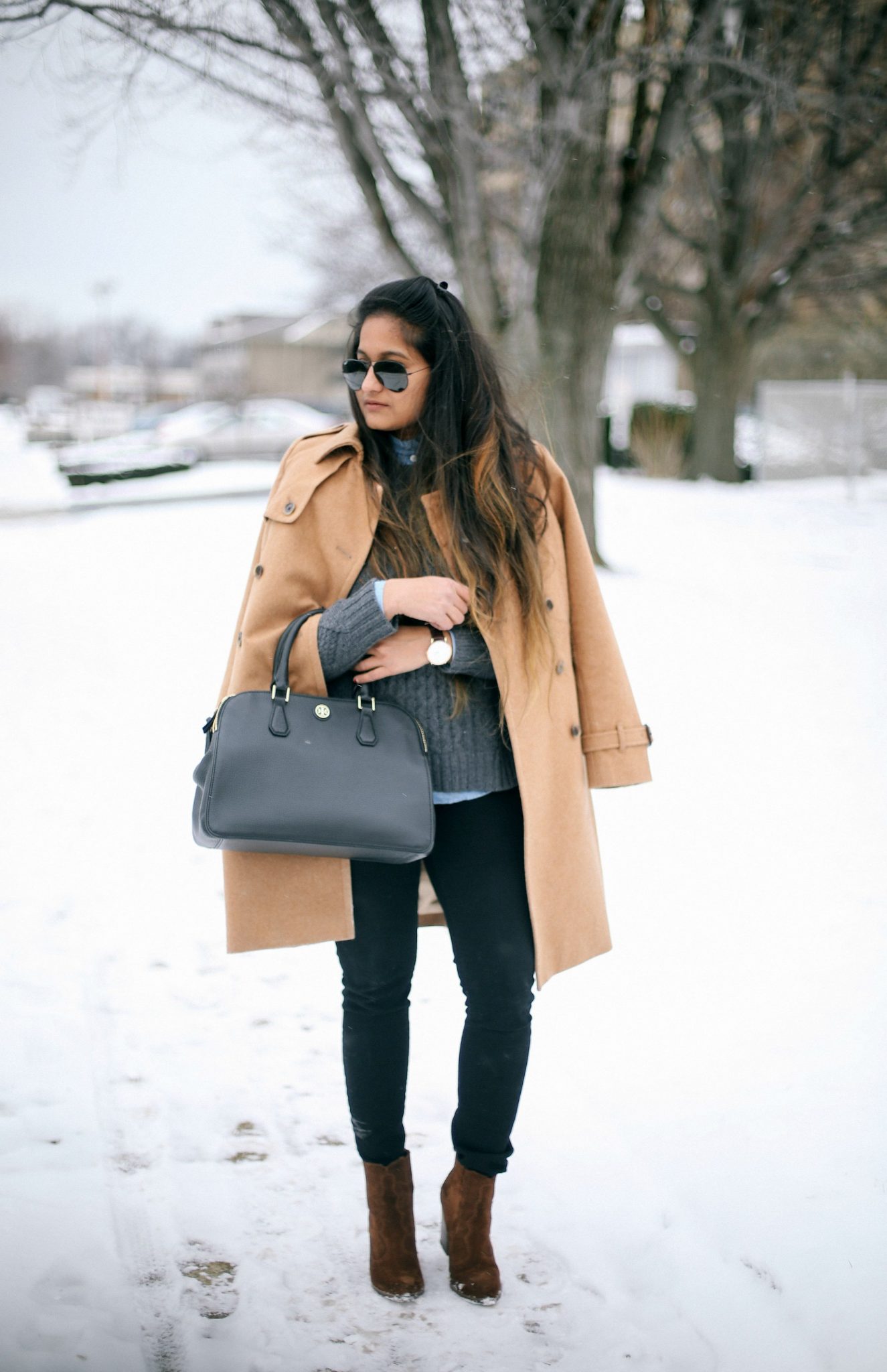 Ruffle neck chambray shirt (similar here and here) | Cable knit sweater (similar here) | Black Jeans | Dolce Vita Boots (last seen here) |Jcrew Trench (similar 1,2,3) | Bag | Watch (c/o)| Sunglasses (also love this)